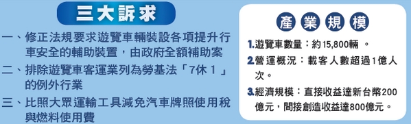 (二)遊覽車客運業有淡、旺季之分,遊覽車產業經營型態特殊無法與僵化之「勞基法」一體適用。
