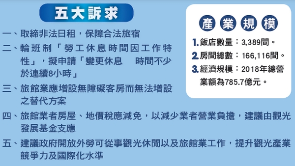 近年來全台非法日租套房猖獗,強烈衝擊旅館業,為有效遏止該狀況,交通部觀光局預告修正《發展觀光條例》第55、55-1條修正草案,主要為嚴懲非法經營觀光旅館、旅館或民宿業者,罰鍰上限最高可罰至200萬元,另協助刊登營業訊息之提供者,將視為共同實施行為義務人「一併處罰」,同樣最多可處200萬元罰鍰。政府應嚴以取締非法日租,以保障合法旅宿的生存空間。
