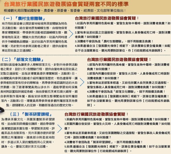 根據旅行社依發展觀光條例第26條、第27條第1項及第3項規定,執行(招攬)或(接待觀光旅客),並安排(旅遊、食宿、交通),都必需以消費者安全情況下,提供有合法營利證之餐廳、民宿旅館、接駁車輛、遊覽車輛,足額履約保險,領有合格導遊證照才能帶領外國觀光客。然而農村、部落、製茶的體驗行程,一樣需要招覽、搭車、餐食、住宿等,請問跟我們旅行社的營業項目有哪一項不同?最後!請問觀光局長官,以上所列與一般觀光旅遊活動【性質有別】?到底哪邊不同!要幫地方創生找生機!那原本守規矩的好學生,就不用照顧嗎?消費者的安全擺一邊,等發生狀況後再來探討嗎?