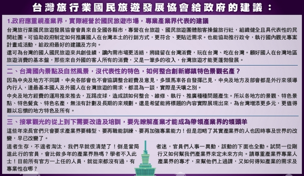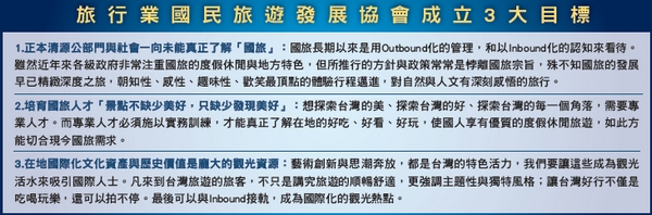 旅行業國民旅遊發展協會自從成立以來,便積極在市場的推廣,並針對現存的法規、產業面臨的問題等爭取修正。旅行業國民旅遊發展協會理事長朱永達表示,市場上很多專做Inbound的協會,許多公協會內也有Inbound以及國民旅遊委員會。國民旅遊市場很大,可惜以往都分散在各公協會裡,力量無法集中。「台灣旅行業國民旅遊發展協會」的出現,不僅專注、專精、專業來配合政府的各行政部門,來為台灣推廣在地的地方特色以及發展人文意象之旅;也要整合專做國民旅遊的業者,以及結合整個相關產業鏈,提供國人享有優質的度假休閒旅遊,畢竟國民旅遊是台灣發展觀光的基石,應該深化台灣的美好,朝在地化、國際化雙重發展。