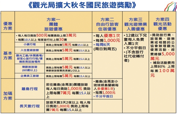 此次《觀光局擴大秋冬國民旅遊獎勵》拍板通過,從9月至12月底已著手進行中,總經費為36億元,4大獎助方案包括「團體旅遊優惠」、「自由行旅客住宿優惠」、「觀光旅樂業入園優惠」與「公協會辦理觀光活動優惠」。