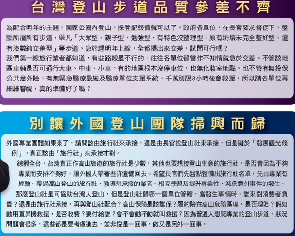 也許「專家、學者、少數業界人士」,都認為是可行,而且是很好的行銷主題,但是往往與實際執行狀況不盡相同,因為登山有其專業的安全考量,在安全係數不夠完整的地區旅遊踏青,意外狀況會很多。