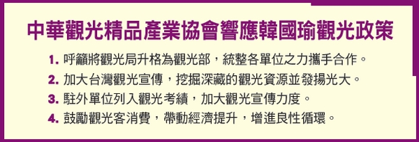 中華觀光精品產業產業理事長吳建忠表示,非常認同韓國瑜的觀光4大策略,包括: