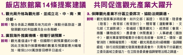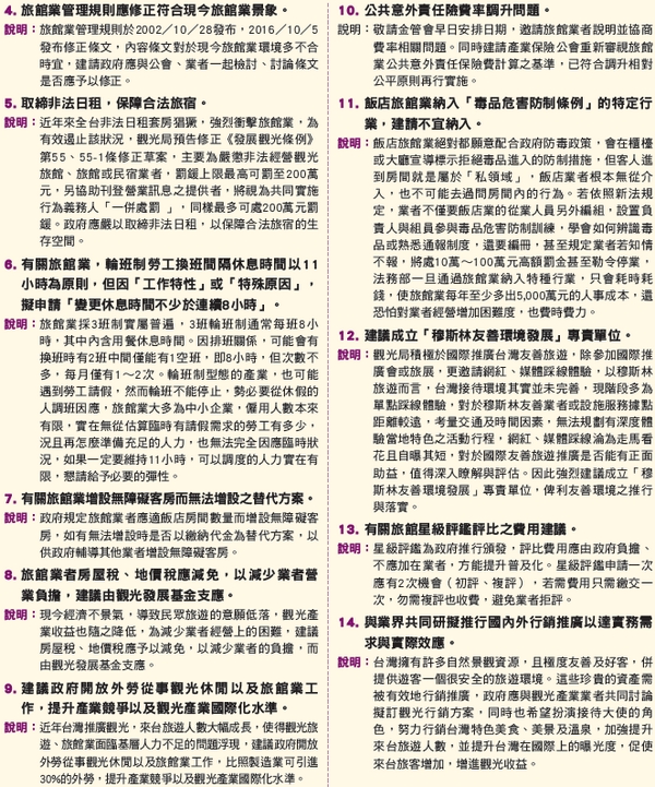 而觀察旅館業所面臨到的眾多問題,張榮南特別彙整14條建言,希望能讓執政者們能夠更加重視旅館產業,一同為觀光產業謀福。