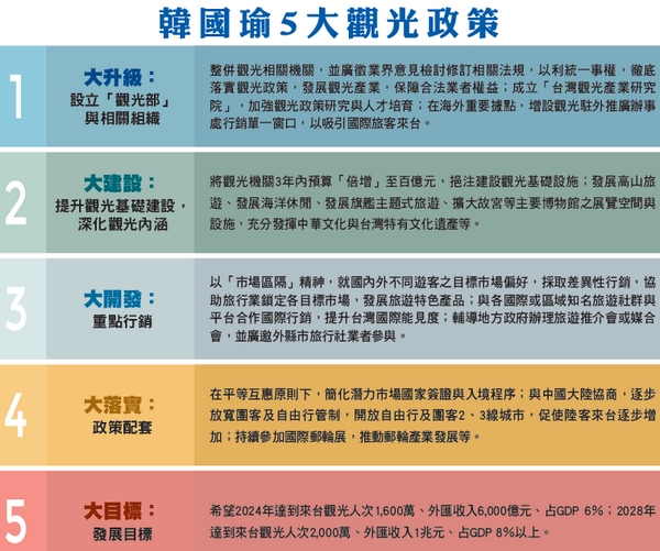 值得一提的是,韓國瑜更提出於海外重要據點增設觀光駐外推廣辦事處行銷單一窗口,吸引國際旅客來台。