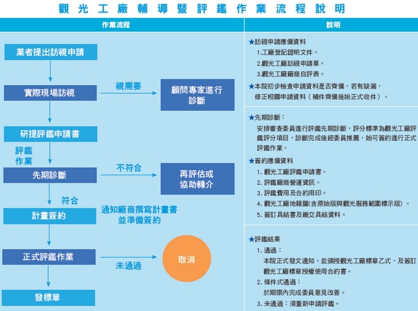 經濟部自2003年起積極輔導台灣傳統工廠轉型兼營觀光服務,製造業服務化的時代來臨,觀光工廠也必須求新求變,透過跨領域匯流,與不同領域跨域合作,跨學界、跨旅宿業、跨科技業,透過異業結合以豐富產業資源,帶動產業發展及地方文化提升,期許觀光工廠邁向新的產業價值與創新效益。為使輔導計畫能有更具體的指標依據,自2008年起訂定評鑑作業機制,共計5大觀光工廠評鑑要素:觀光工廠主題、廠區空間規畫、導覽解說與體驗設施、企業形象與文宣設計、觀光工廠營運模式,經由數次嚴格評鑑考核,目的在於確保每位進入工廠觀光的旅客,能在參訪工廠製程與認識產業文化之餘,安心的體驗產業特色文化,讓原本閉門造車的工廠亦能展開雙臂,經由一系列的導覽:認識產業、閱讀文化、參觀製程,發現傳統製造業生生不息的活力,再透過體驗商品進而安心消費的良性循環,促成產業再生並活絡地方經濟的群聚擴散效應。
