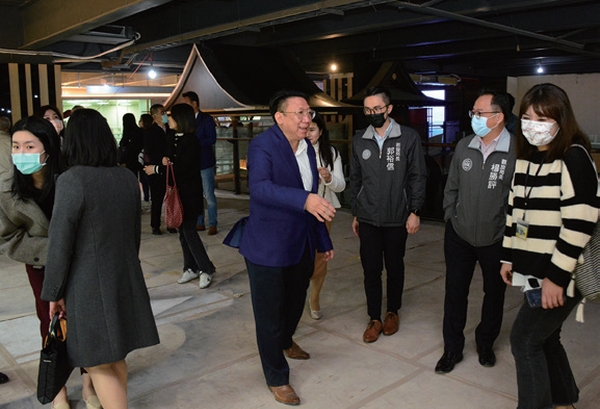 ▲在手信坊總經理陳世洋(中)的導覽下,桃園市政府經濟發展局局長郭裕信(右3)、桃園市政府觀光旅遊局局長楊勝評(右2)走訪正在興建的「手信霧隱城」