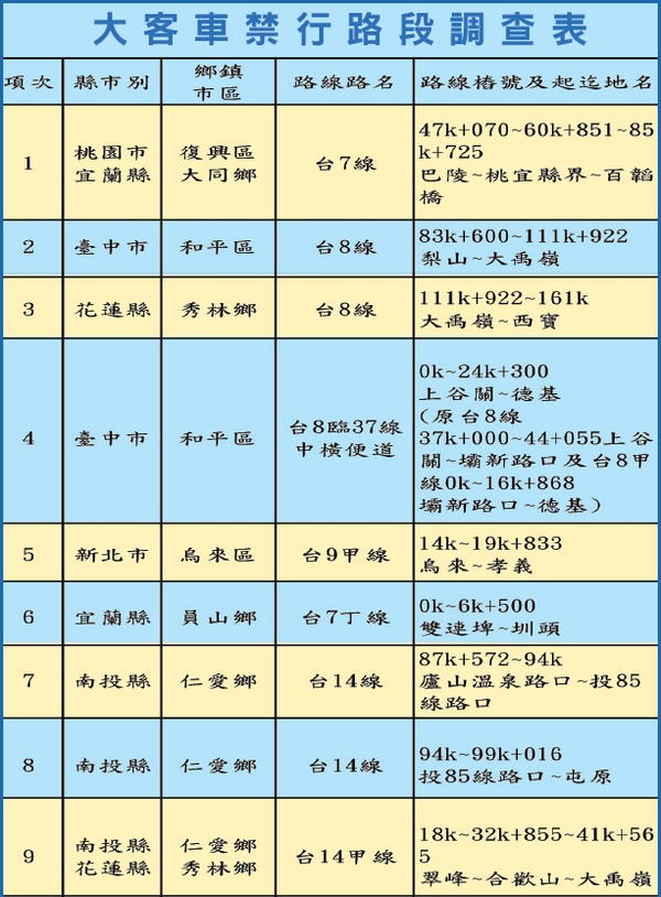 ★根據道路交通安全規則編章節條文,小客車定義為座位在9座以下之客車或座位在24座以下之幼童專用車。其座位之計算包括駕駛人及幼童管理人在內的車輛。此類的車輛比較甲、乙類的大型遊覽車擁有更靈活彈性的路線選擇,能夠前往較為秘境的地方。目前公路總局總共有20處路線禁行大客車,如下表格所示,包括梨山、谷關、巴陵、合歡山、塔塔加、霧台等著名景點,都是遊客趨之若鶩的觀光勝地。蕭明仁表示,因此建議與導遊協會合作,透過理事長許冠斌的整合能力,將小客車與導遊人員結合,旅客或是旅行社只要上網登記(建議24小時前)所需求的車輛數與導遊人數,就能讓旅客輕鬆抵達景區,更能得到最完善的導覽解說。