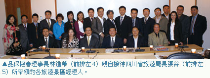 四川省旅遊局於11/7率團拜會品保協會,品保協會理事長林進榮、秘書長陳怡全與理事共同出席接待。四川省旅遊局長張谷表示,感謝台灣各業者的熱情接待,而四川省旅遊局本次也邀集了四川省各旅遊景區的經理人共同參與此次台灣拜會及考察行程,包括九寨溝管理局、峨嵋山管理委員會、樂山大佛景區管委會、四姑娘山管理局、西岭雪山旅遊開發公司等等,並由衷希望台灣業者就四川旅遊產品進行包裝。