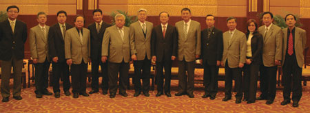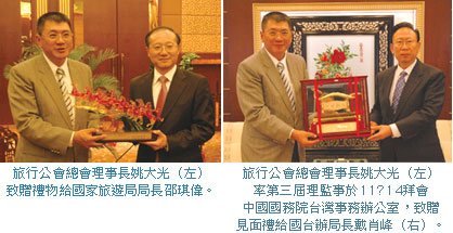 ▲旅行公會總會理事長姚大光(右6)率領副理事長許禓哲(左2)、副理事長林尚志(左4)、副理事長黃瑞榮(左6)、理事許淑玲(右3)、監事主席張玉林(左7)、監事吳雁輝(右4)、台中縣旅行公會理事長鄭錫庸(右2)於11/13拜會中國國家旅遊局,局長邵琪偉(右7)與副局長張希欽(左5)親自接待。
