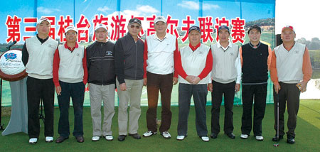 (左起)桂林高爾夫球協會秘書長高焰、桂林業者韋志德、旅行公會總會創會名譽理事長曾盛海、桂林旅遊股份有限公司董事長陳青光、旅行公會總會理事長姚大光、桂林市政協副主席王大平、廣西高爾夫協會主席謝向東、桂林旅遊股份有限公司總裁鐘新民、桂林業者白先德。