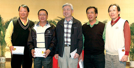 旅行公會總會創會名譽理事長曾盛海(左2)與理事張金平(左1)贏得近洞獎,接受旅行公會總會監事主席張玉林(中)頒獎。