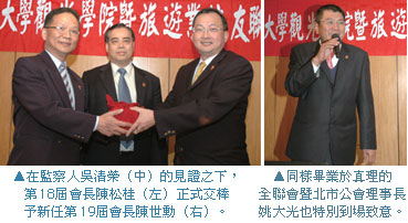 成立即將邁入第32年的真理大學觀光學院暨旅遊業校友聯誼會,於日前舉辦新春餐敘暨第十九屆會長與幹部的交接儀式,不少在業界耕耘有成的「淡水幫」旅遊同業紛紛出席此一盛會彼此寒暄問候,場面十分溫馨。於會中正式卸任的第18屆會長陳松桂表示,校友會成立至今超過30年,不僅在業界有著相當的影響力,也是維繫同業情誼的一股力量,希望未來由真理觀光系所畢業的校友能夠秉持著優良的校風,繼續讓台灣的觀光發光發熱。