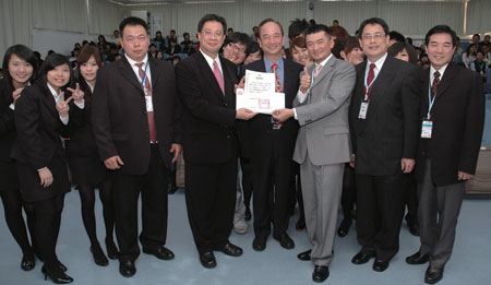 天喜、北台科技學院攜手開辦知識學院,由北台科技學院董事長鄭逢時(前排左3)董事王孟平(前排右2)與校長連信仲(前排左2)共同頒發客座副教授證書給天喜旅行社總裁郭正利,左1為該校觀光系系主任陳寅全。