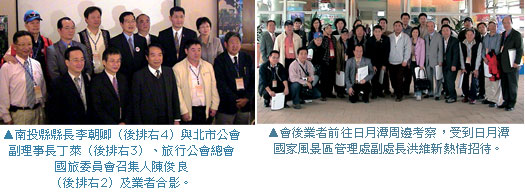 同時,會中相關單位接連報告南投縣府大型活動計畫,藉此邀請全台旅行業者共同加入推廣南投觀光產業的行列。由於南投地區不乏聲名遠播的知名景點,會中雙方討論格外熱烈,並逐一針對業者關心的議題討論並決議,包括建立主管機關與旅遊產業及各地方風景局處聯繫窗口,進而整合合各地旅遊相關資訊以利同業運用、提升國民旅遊業務產值、國民旅行卡、民宿問題等等多項議題。此外,會後業者轉赴觀光局日月潭國家風景區管理處,由副處長洪維新接待並進行簡報,業者也順道前往周邊飯店與景點考察。據了解,會議活動過程順暢而圓滿,參與會員對此次旅行公會總會能夠舉辦此次結合主管機關與縣市政府之產官討論模式給予高度肯定,一般認為能藉此增進業務互動交流,還可面對面廣泛交換意見,對於操作國旅業者裨益良多。
