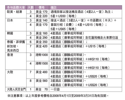 品保協會日前公佈4~6月團體價格參考表,針對來台觀光線,特別點出第2季是以端午節龍舟嘉年華為銷售特色。為刺激台灣觀光,力拚來台旅客400萬人次,觀光局將2008?2009定為「旅行台灣年」。配合2008北京奧運、2009高雄世運、台北聽障奧運,優惠過境旅客住宿每晚美金79元,並送市區觀光專案。除了推廣台灣民俗節慶及一般傳統行程外,根據北、中、南、東地區,因資源不同而包裝策劃的經典行程、登山健行、醫療保健、鐵道、農業觀光、溫泉美食養生、追星哈台、運動、生態、婚紗攝影等,除此還邀請知名藝人代言日、韓—F4;東南亞—蔡依林、吳念真,另W劃各地區來台旅客分別促銷優惠條例。