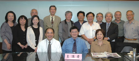 (前排左起)多聞會現任會長劉欣宙、國際思奧思台北分公司業務發展經理汪勝龍、多聞會創始會長徐敬德與參與講習的會員合影。