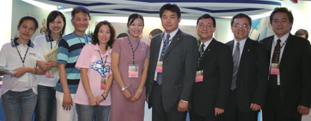 ▲開幕當天貴賓雲集,由(左起)ANTOR駐台觀光代表聯誼會長施春庭、海基會秘書長游盈隆、屏東縣長曹啟鴻、高雄市旅行公會理事長林尚志、副總統呂秀蓮、高雄市旅行公會監事會召集人黃金祥、高雄縣副縣長葉南銘、行政院顧問林富男、觀光局副局長郭蘇燦洋、旅行公會總會暨北市公會理事長姚大光、建台水泥公司總經理鄭吉田與日本觀光協會常務理事江田猛。
