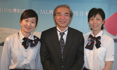 ▲日本航空高雄營運處旅客業務部經理邱精文(中)與空姐。