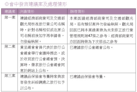 至於資訊發展委員會則報告,2年來已處理40件非法網站檢舉,與14件非旅遊業者刊登的非法報紙廣告,所有案件均已勸導完畢,不接受勸導者已交由觀光局進行處理。資訊發展委員會召集人李謙宏與多家科技公司接觸,並將科技公司所提供的服務納入公會,會員可利用公會所爭取的各項資源,包括手機節費服務、客戶管理系統等等,可有效協助同業減縮成本。
