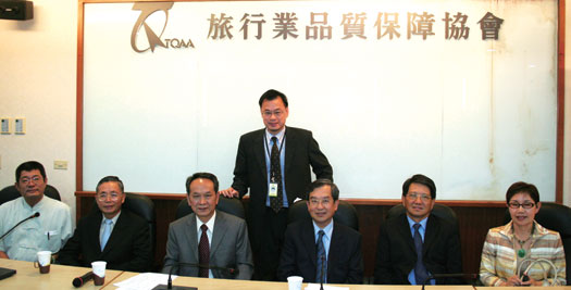 ▲(前排左起)品保協會旅遊品質督導委員會副主委/川流國際旅行社副總經理陳敏達、調解委員會主委/世邦綜合旅行社董事長陳屬庄、品質督導委員會主任委員/名冠旅行社董事長吳志崧吳志崧、品保協會副理事長/喜美旅行社總經理黃文桂、公關宣導委員會主委/雄獅旅行社總經理孫明台、旅遊品質督導委員會副主委/金漢妮旅行社總經理連郁卿、(立者)委員/洋洋旅行社行銷企畫部副總經理王治國攝於本季旅遊團費價格新聞發表會現場。
