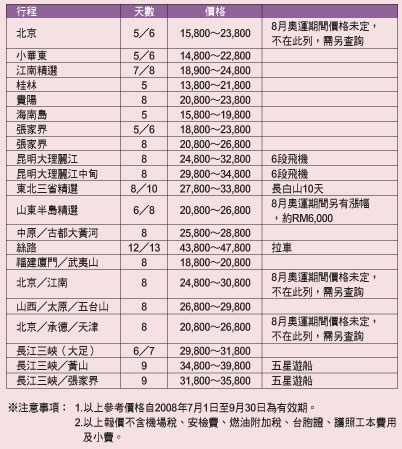 ※注意事項: 1.以上參考價格自2008年7月1日至9月30 日為有效期。