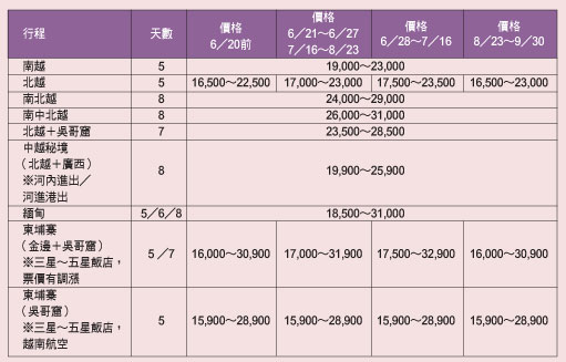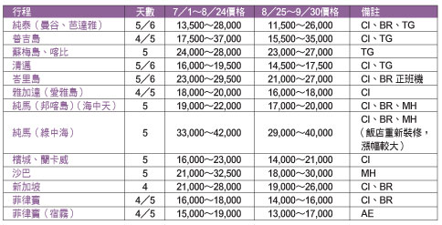 品保協會旅遊品質督導委員會顧問/東南旅行社副總經理廖培沅表示,暑期的東南亞線價格較去年漲幅相對較低,約漲1~2千元不等,對於親子團體負擔較小。但由於東南亞行程通常涵蓋有許多島嶼旅遊元素,海島飯店房間價格一般在暑期會有調高趨勢,加上各國匯率異動變化甚大,台灣旅客前往東南亞地區旅遊,在不同的暑期波段,或者在團費上會有不同的價差。