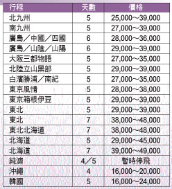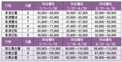 在東北亞線部分,廖培沅提到,東北亞的日本北海道還是人氣商品,此時除有溫泉美食的基本誘因,富良野的薰衣草花田盛況也吸引許多旅客。此外如東京迪士尼樂園或豪斯登堡、HELLO KITTY三麗鷗彩虹樂園也是業者包裝親子遊的重點。整體而言7、8月與上季相較漲幅約在4千元到8千元不等,9月可望下修價格,但也比去年同期多2千元以上。價格的上修除因暑假期間機票價格調高,最受旅客青睞的北海道及東京、大阪等地的飯店,房價漲幅也較往年多。