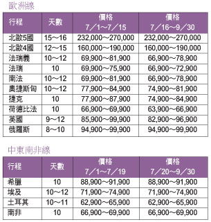 中東部分,埃及線在暑假期間的售價並沒有上漲,而土耳其政治趨於穩定,旅遊市場已陸續回溫,預計從7月起可漸進入旅遊旺季。唯因國情差異大,遊客參團方式旅遊較可避免無謂的旅遊糾紛,希臘線7月氣候相當適合,比較其他長程線也是漲幅較小的區塊。非洲匯率並無強勢走高,所以遊客暑期參團還是不錯時機,與去年同期相較調漲3千元左右。