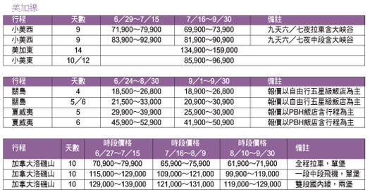 品保協會旅遊品質督導委員會委員/洋洋旅行社行銷企畫部副總經理王治國表示,暑期的美西行程以舊金山、優勝美地或黃金17哩路、拉斯維加斯、大峽谷天空步道及洛杉磯環球製片廠、狄士尼樂園為安排重點。到了美東行程則強調美國及加拿大的東岸巡禮,如住宿尼加拉瀑布加拿大邊境、紐約曼哈頓區的安排,都深受旅客喜愛。加拿大旅遊部分,今年業者在行程安排上,不僅是傳統拉車單堡或雙堡的行程,行程內容多有搭乘一段國內線或兩段,甚至安排搭乘火車的創意動線元素,整體而言,美加線較去年同期,漲幅都超過15,000元以上。