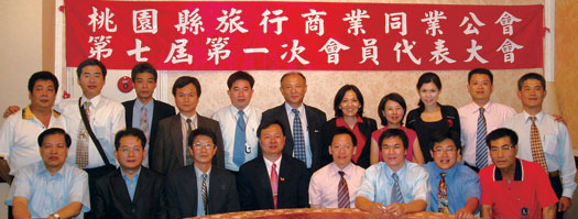 ▲桃園縣旅行商業同業公會舉行代表大會,現任理事長周俊華高票連任。(前排左3起)第六屆常務監事楊國明、第六、七屆理事長周俊華、第七屆常務監事吳紹周。