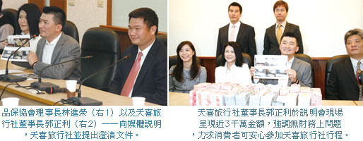 品保協會理事長林進榮指出,12╱2天喜旅行社提供其關係企業喜達旅行社及天喜旅行社董事長郭正利等共3處不動產設定不動產抵押權擔保債權總金額新台幣1億元給品保協會,包含台北市博愛路總公司,以及新台幣1億7千2百萬的旅約保險金,藉此來使旅遊消費者放心,權益獲得保障。