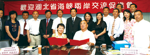 ▲ (前排左)湖北省咸寧市旅遊局局長杭鶯與北市旅行公會副理事長丁萊簽署合作交流備忘錄。