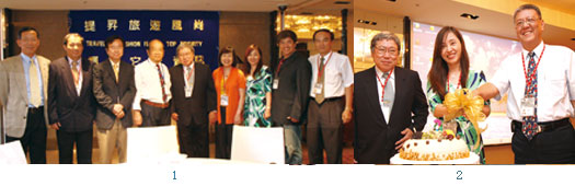 1. 群英會會長張純青(左5)與群英會會員,一同與東南科技大學資訊工程系主任張錚(左4)合影。2. (左起)群英會會長張純青與6月壽星富邦旅行社經理吳毓玲(中)、康喜旅行社總經理孟志鈞共同慶生。