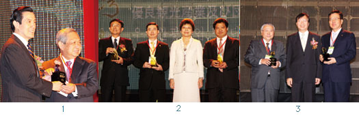 3.交通部次長陳威仁頒發台灣觀光貢獻獎給中華航空董事長魏幸雄(左)及長榮航空董事長林寶水(右)。
