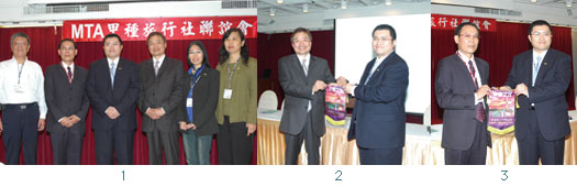 1.(左起)甲聯會第二副會長暨康喜旅行社董事長孟志鈞、東倫財產規劃董事長吳竣益、甲聯會會長暨二十一世紀旅行社董事長楊先煇、澳門旅遊局台灣代表處行銷經理林鴻祥、甲聯會第一副會長暨萬客隆旅行社總經理吳佳怡、甲聯會秘書處秘書長暨吉祥旅行社董事長王明俐。2.甲聯會三月例會主題主獎貴賓、澳門旅遊局台灣代表處行銷經理林鴻祥(左),接受授旗儀式。3.甲聯會三月例會主題主獎貴賓、東倫財產規劃董事長吳竣益(左),接受授旗儀式