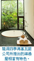 面積有16.8公頃的「龍洞四季灣」,是國內首座結合海水游泳池、地質解說展示館、休閒遊艇港的多功能遊憩中心,純白色的歐風尖塔造型會館,在蔚藍的海水映襯下,顯得格外耀眼。園區內的SPA海湯屋貼心舒適,精緻的裝潢不論是海景房或山景房都十分搶手。