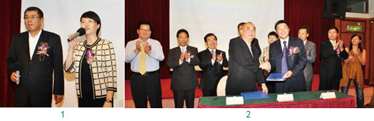 1.揚州市委書記王燕文(右)、旅行商業同業公會總會理事長姚大光(左)主持抽獎活動。2.揚州市旅遊局局長湯天波(前右)、北市旅行商業同業公會副理事長丁萊(前左)簽訂互惠合約。揚州市副市長王玉新(後排左3)等人見證。