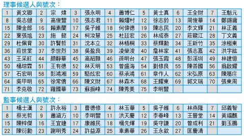 品保協會第八屆理監事改選號次,已於9╱14假品保協會抽出,並預計於10╱20第八屆第一次會員代表大會中同時進行理監事的選舉,而新任的理事長也將於同日一併選出。此次,品保協會理事候選人共有75位,監事候選人共有27位,預計將選出35位理事與11位監事。