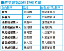 2.群英會第20屆會長朱祺雨(右4)與各組召集人:(左2起)活動組葉庭林╱謝錫麟、財務組林義順、公關組吳勛豐、風紀組林博宗、秘書長王采虹、會員組劉大鴻合影。