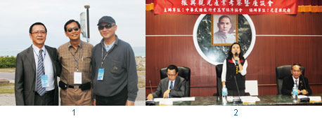 1.(左起)品保協會理事長曾盛海、菲律賓旅行商業同業公會顧問施春庭、世航旅行社總經理高永棻合影於花蓮七星潭。2.花蓮縣政府觀光處處長陳又珍(中)主持振興花蓮觀光產業座談會。