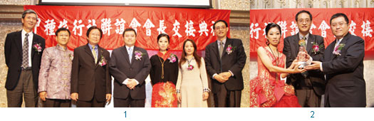 2.甲聯會新舊任會長交接儀式,由第六屆會長李謙宏(中)擔任監交人,第七屆會長楊先暉把獎座交給第八任會長吳佳怡(左)。