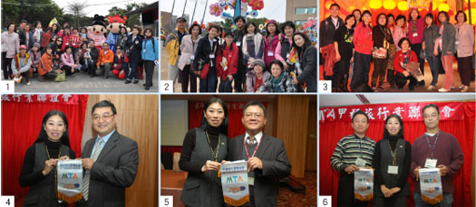 1、2、3甲聯會會員開心參與2011開春第一檔的Outing。4、5甲聯會會長吳佳怡(左)與演講貴賓科威資訊總經理蔡麗邱以及祐誠會計師事務所楊勝彬。6.甲聯會會長吳佳怡(中)頒發會員旗給新進會員永泰昌國際旅行社總經理陳豐華(左)與上久旅行社董事長蔣立民。