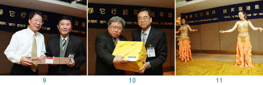 7.群英會舉行春酒晚宴,會長朱祺雨(左)邀請來自北京的揚珊集團董事長陳金莓同樂。8.群英會會長朱祺雨(左)為2月壽星同學—世邦旅行社董事長陳屬庄慶生。9、10群英會春酒,同學們抽名片交換禮物,氣氛溫馨。11.晚宴邀請肚皮舞者演出,動感熱力感染全場。