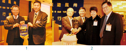 1.群英會會長朱祺雨(右)授旗予講師祐誠會計師事務所楊勝彬。2.群英會會長朱祺雨(左2)與3月壽星桃園楊梅/東森山莊渡假村首席代表田書治(右1)、柬威旅行社總經理王采紅(右 2)、前金華旅行社董事長林國棟(左1)合影。
