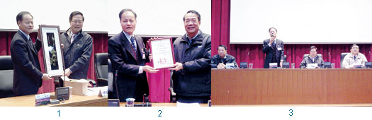 1.南投縣長李朝卿(右)與中華餐旅經理人協會理事長楊明惠交換禮物。2.中華餐旅經理人協會理事長楊明惠(左)頒發感謝狀予南投縣政府觀光處處長洪文能。3.中華餐旅經理人協會理事長楊明惠(左2)與(左起)、觀光處處長洪文能、南投縣長李朝卿、前交通部觀光局副局長郭蘇燦洋舉行座談。